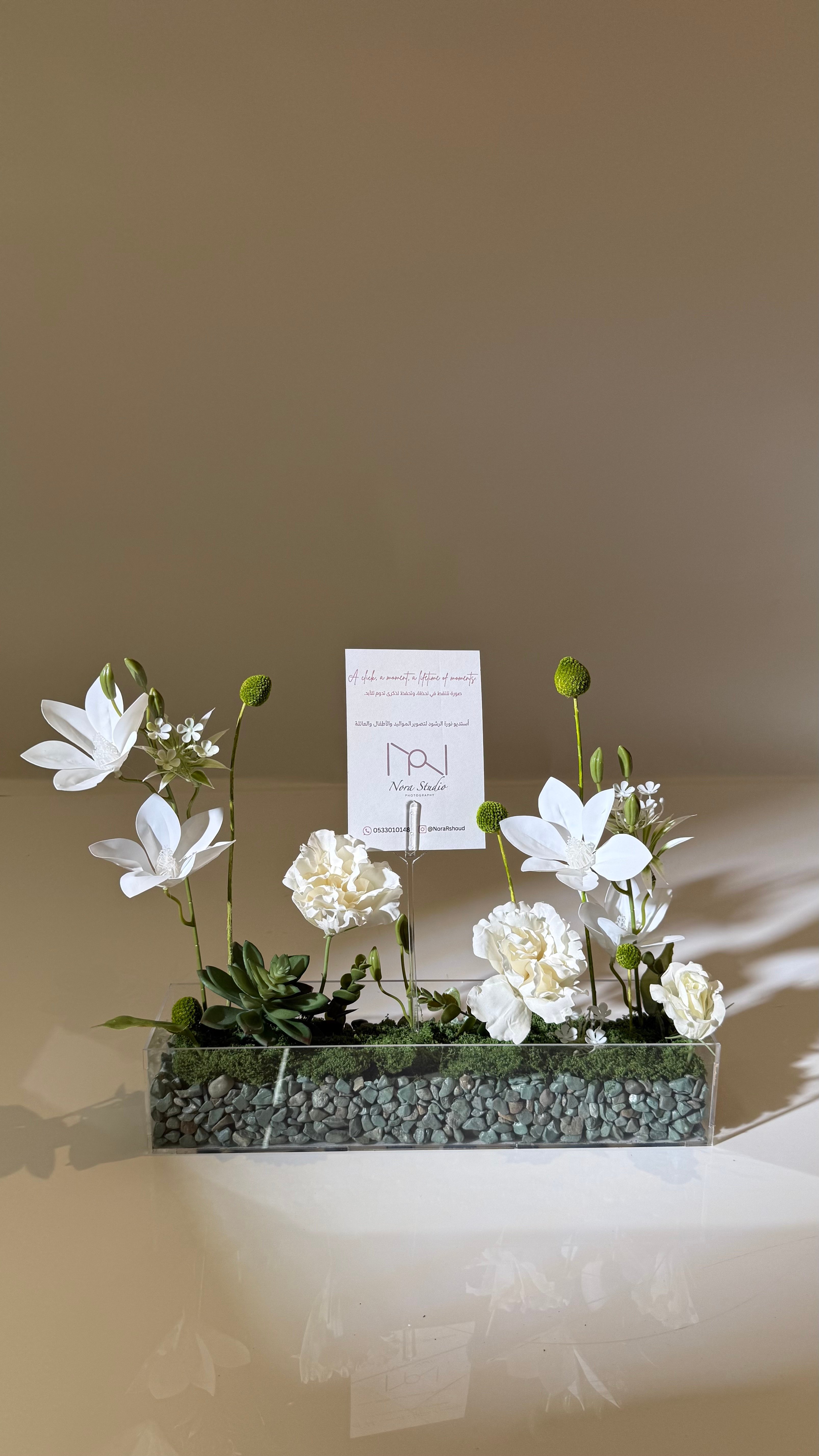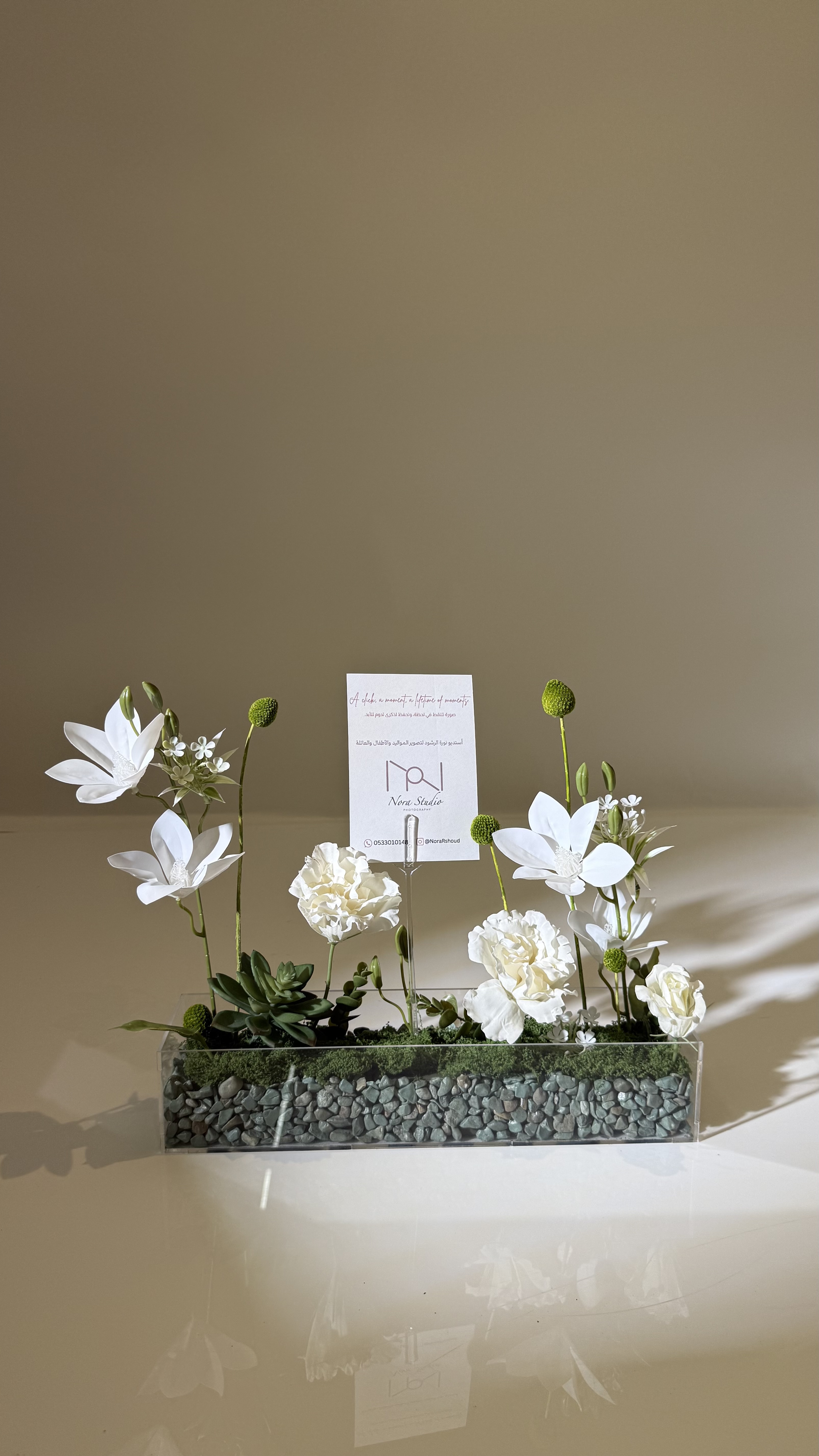 تنسيق زهري أبيض فاخر بتصميم اكريلك مستطيل شفاف مزين بأحجار خضراء، يمنح لمسة فخمة وهادئة لأي مساحة.