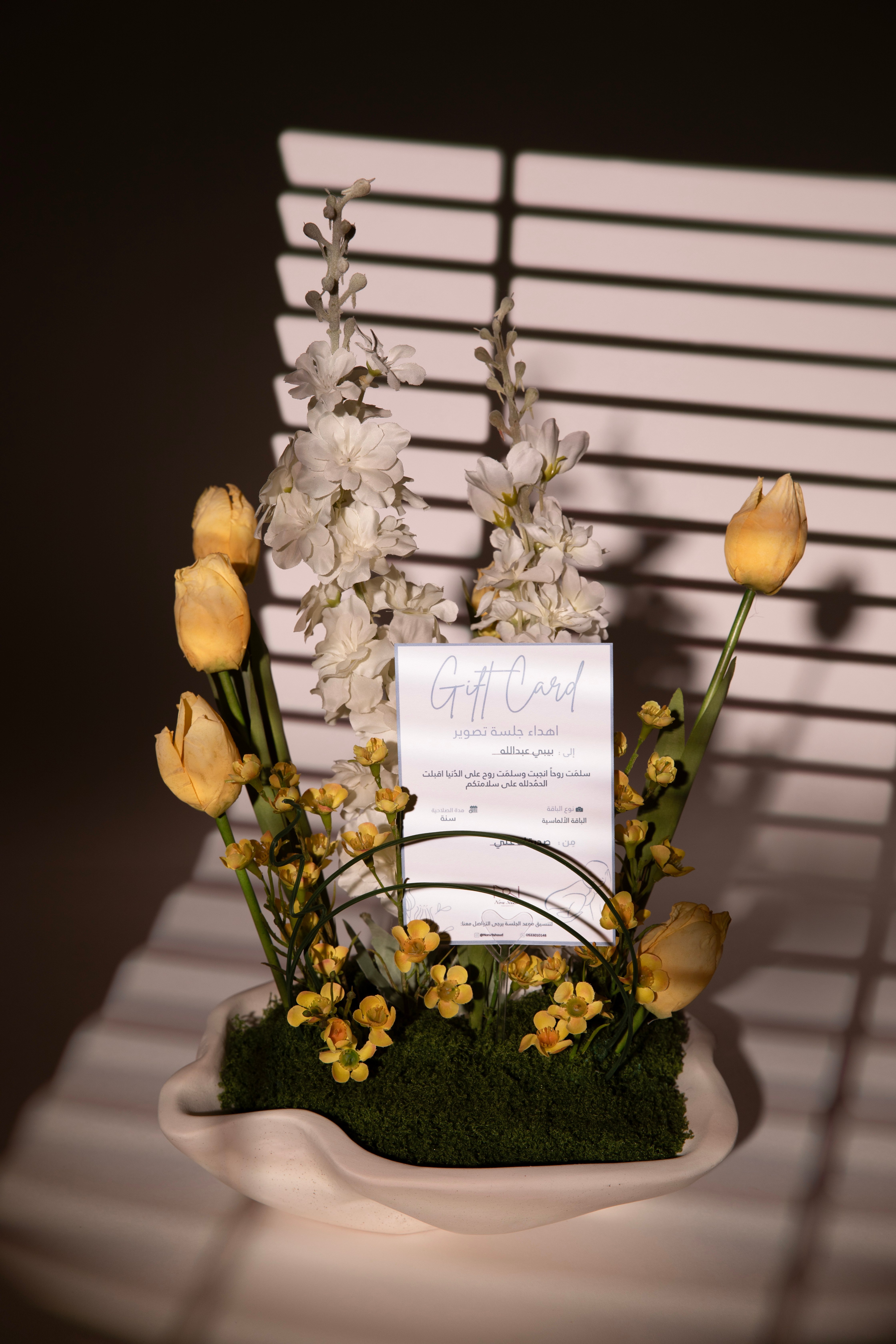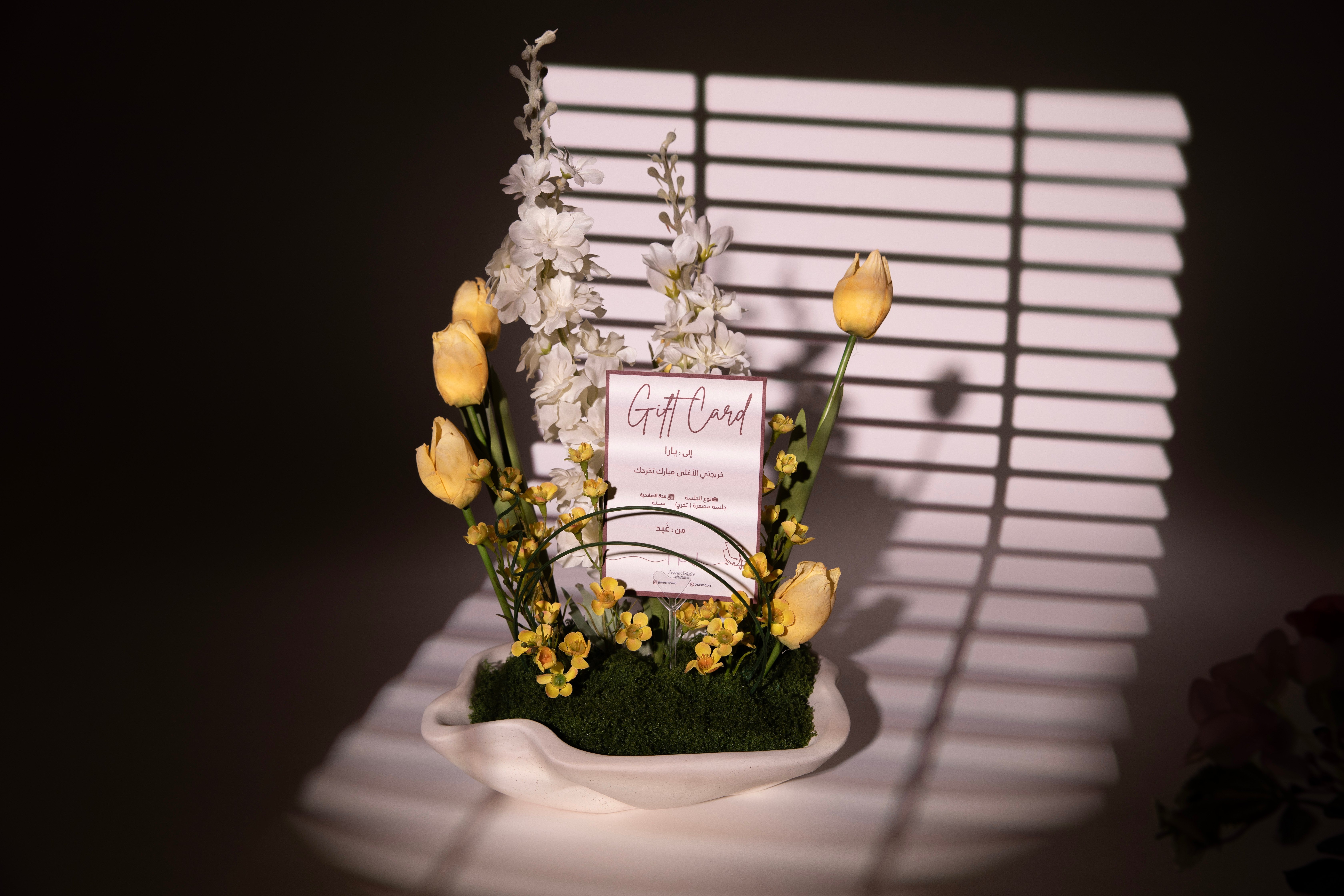 تنسيق أنيق يحمل طاقة البهجة والدفء، يجمع بين زهور صفراء و بيضاء بتناسق فخم