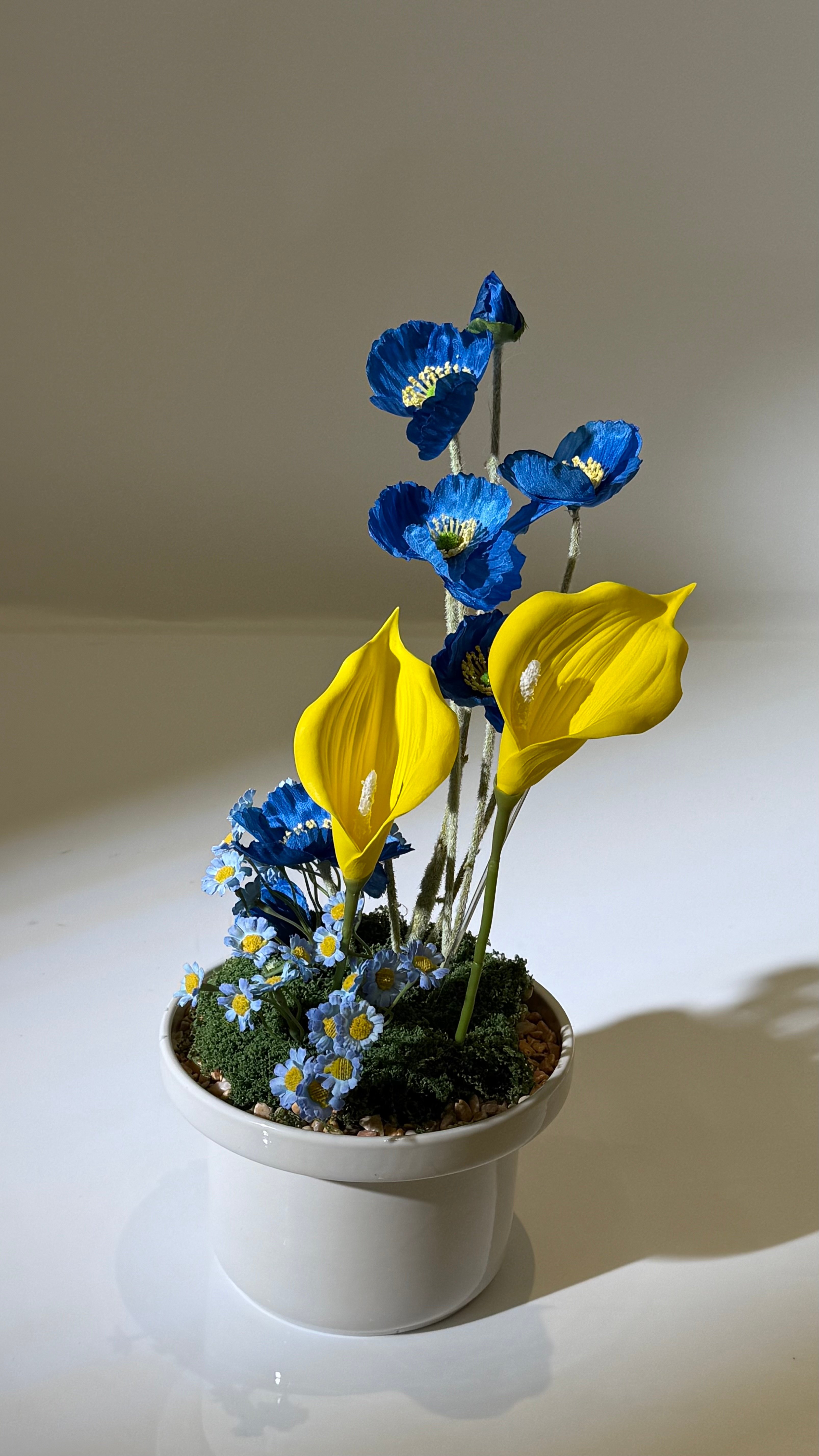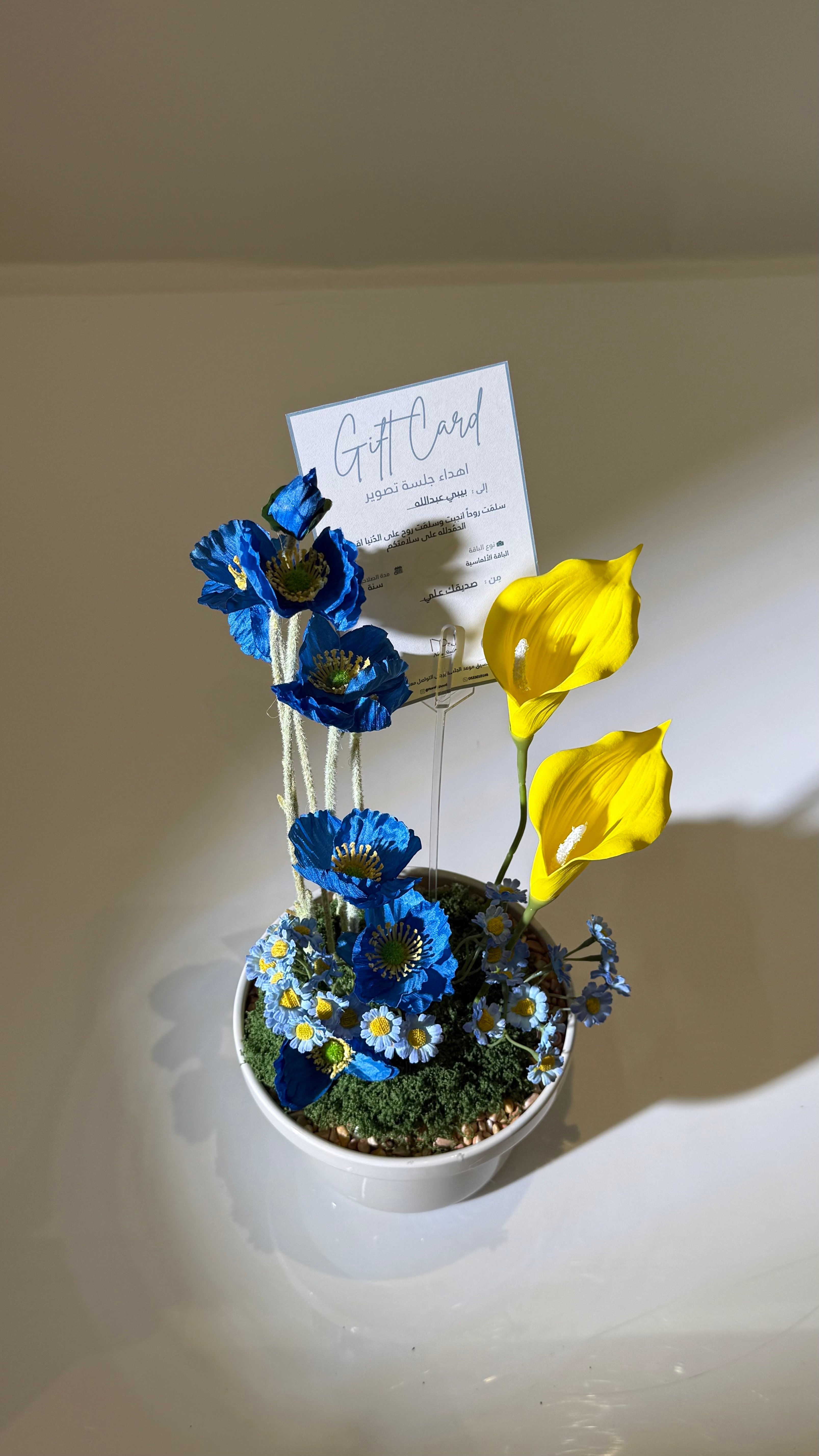 تنسيق زهري صغير بتصميم أنيق يجمع بين الأزرق الملكي والأصفر الفاتح، مقدم في وعاء أبيض ليمنح لمسة حيوية راقية.