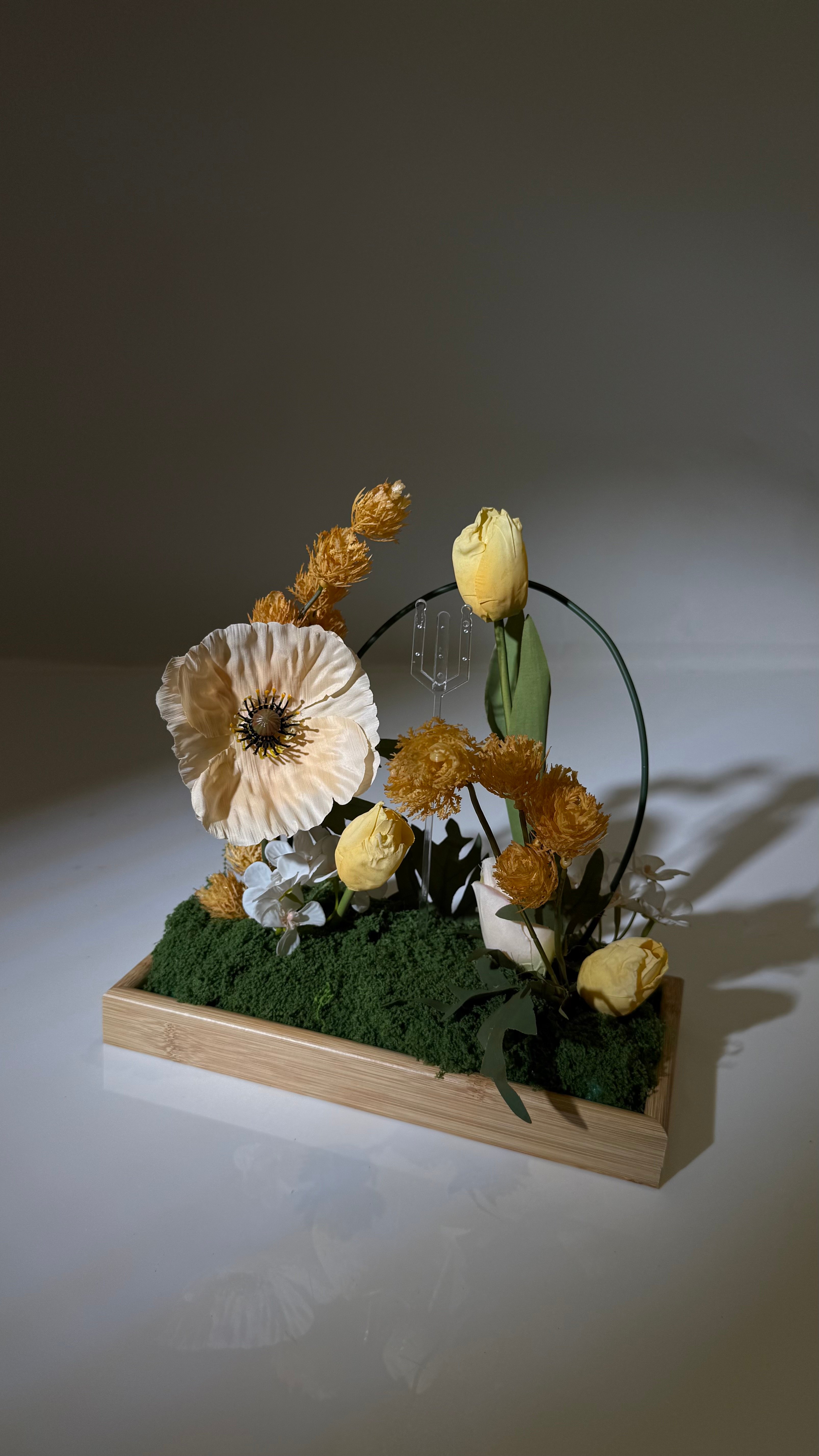 تنسيق زهري بدرجات الأصفر والبيج بتصميم أنيق على قاعدة خشبية، يمنح لمسة دافئة وطبيعية للمكان.